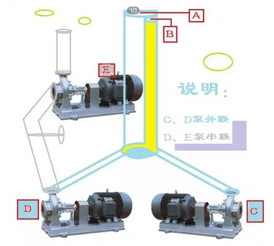 圖中:泵“D“的出口與泵“E”的進(jìn)口通過(guò)管道連接形成串聯(lián),經(jīng)水 泵串聯(lián)后,介質(zhì)先進(jìn)入泵“D”的進(jìn)口,經(jīng)泵“D”的運(yùn)行,將介質(zhì)推 送到泵“E”的進(jìn)口,通過(guò)泵”E“的運(yùn)行,將介質(zhì)輸送到需要的地方。 水泵串聯(lián)實(shí)質(zhì)是階梯輸送的延伸,何為階梯輸送?是指下游的水位太低,而要引入的位置又太高,用一臺(tái)水泵運(yùn)行根本無(wú)法“完成使命”。